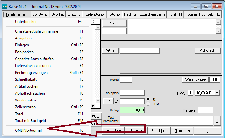 Um einen Kassenbeleg erneut auszudrucken, gehn Sie in der Kassenmaske auf Funktionen und Online-Journal: