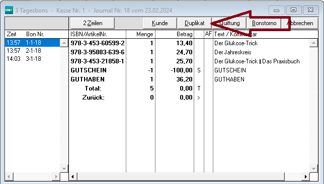 Im folgenden Fenster können Sie im linken Fenster den gewünschten Kassenbeleg auswählen und über die Schaltfläche Duplikat erneut ausdrucken: