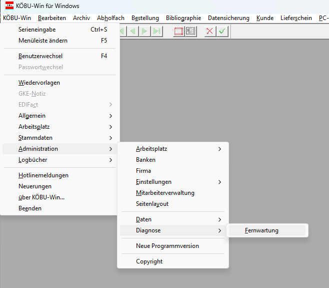 Gehen Sie im Menü auf KÖBU-Win, Administration, Diagnose und Fernwartung.