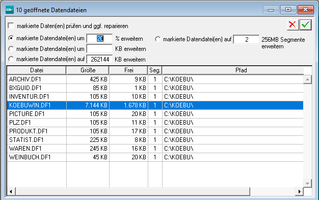 Im folgenden Fenster klicken Sie die Zeile KOEBUWIN.DF1 an (bis diese blau hinterlegt ist) und geben oben beim Eintrag markierte Datendatei(en) um EINGABE FELD % erweitern, einfach die Zahl 20 ein.