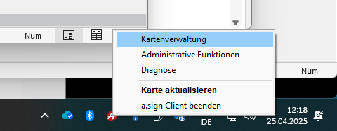 Um die Version der Signaturkarte zu überprüfen klicken Sie auf das Symbol des a.sign Client rechts unten in der Windows Startleiste mit der rechten Maustaste auf das Symbol und wählen hier Kartenverwaltung.