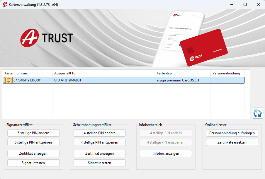 Unter der Spalte Kartentyp finden Sie die Version der Signaturkarte (hier in der Beispielabbildung ist dies CardOS 5.3)